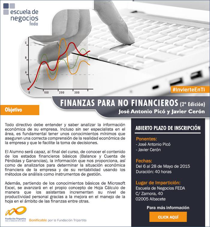 Desde Escuela de Negocios FEDA y ante la demanda de formación relacionada con el contenido de los estados financieros básicos (Balance y Cuenta de Pérdidas y Ganancias) , te adjuntamos información sobre el próximo Curso de Finanzas para no Financieros, en su segunda edición y creemos de especial interés tanto para autónomos, trabajadores y desempleados.