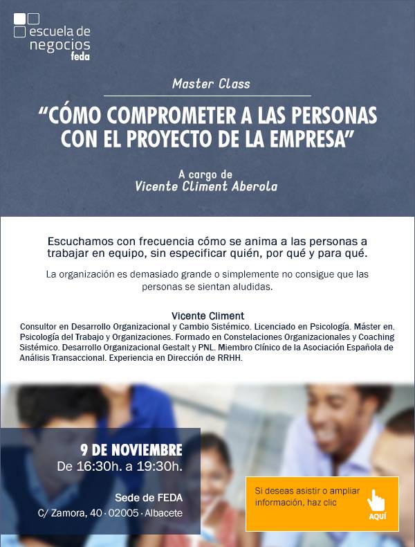 Escuela de Negocios FEDA tiene el placer de invitarte a la Master Class que, bajo el título COMO COMPROMETER A LAS PERSONAS CON EL PROYECTO DE LA EMPRESA, impartirá el profesor Vicente Climent el próximo lunes;9 de noviembre a las 16:30 horas en FEDA Albacete.