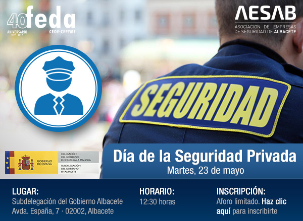 Acto del Día de la Seguridad Privada, que tendrá lugar el próximo martes, 23 de mayo, a las 12:30h. en la Subdelegación del Gobierno de Albacete, en colaboración con la Asociación de Empresas de Seguridad de Albacete (AESAB), integrada en FEDA.