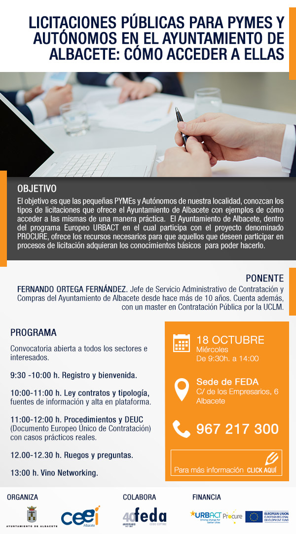Dado que las Pymes y Autónomos de nuestra ciudad han trasladado en diferentes foros, a través de los representantes de sus Asociaciones Sectoriales, el grado de dificultad y desconocimiento de los procesos de licitación, parece está una oportunidad importante para despejar dudas, familiarizarse con los procedimientos y conocer los tipos de licitaciones que ofrece el Ayuntamiento de Albacete y cómo acceder a las mismas.