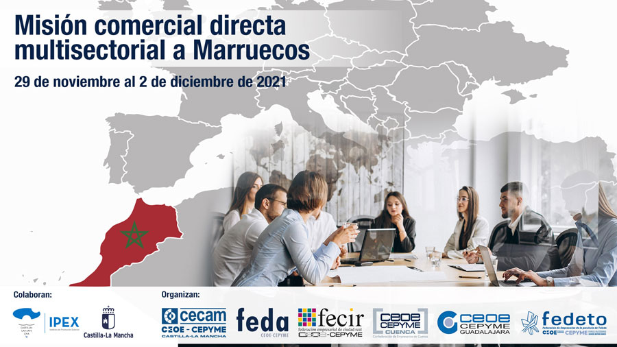 Objeto: El IPEX en colaboración con la Confederación de Empresarios de Castilla-La Mancha (CECAM), y sus respectivas organizaciones patronales: FEDA, FECIRCEOE-CEPYME CUENCACEOE-CEPYME GUADALAJARA FEDETO, promueve la participación agrupada de empresas que desarrollen su actividad económica en Castilla-La Mancha, en la MISIÓN COMERCIAL DIRECTA MULTISECTORIAL A MARRUECOS, que tendrá lugar en Casablanca entre el 29 de noviembre y el 2 de diciembre de 2021.