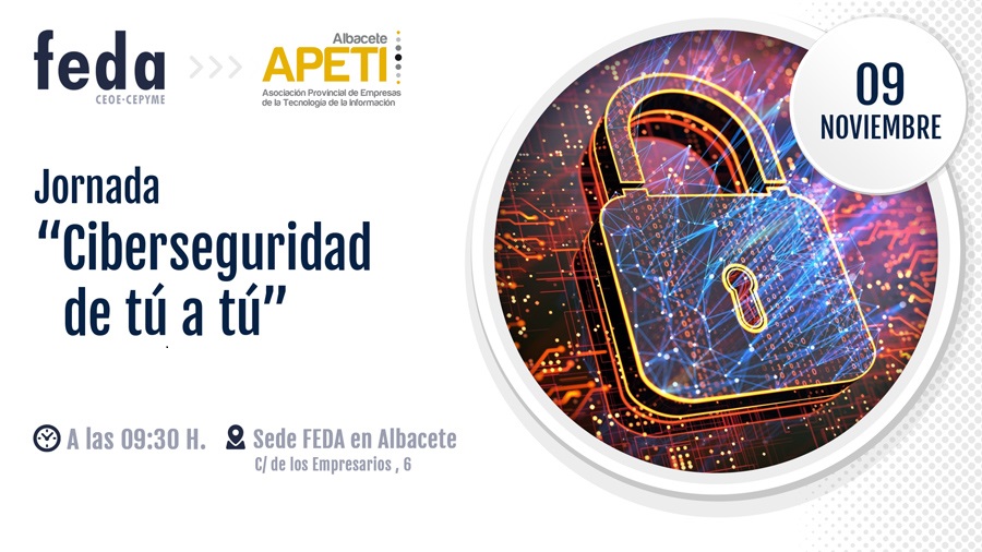 Desde la Asociación Provincial de Empresas de la Tecnología de la Información, APETI, junto con FEDA, te invitamos a participar en la Jornada “CIBERSEGURIDAD DE TÚ A TÚ”, donde contaremos con Yolanda Corral, experta en la materia. La jornada tendrá lugar el próximo miércoles 9 de noviembre a las 09:30 horas, en la Sala Polivalente de FEDA (C/ de los Empresarios, 6 - 3ª planta - Albacete). El objetivo de la jornada es que empresarios, profesionales del sector y emprendedores, puedan conocer buenas prácticas de higiene digital que les ayuden a usar dispositivos tecnológicos y gestionar el entorno digital de forma más segura así como aprender a reconocer las principales amenazas y riegos en la red, para prevenir. Si estás interesado en participar haz clic en la imagen e inscríbete.