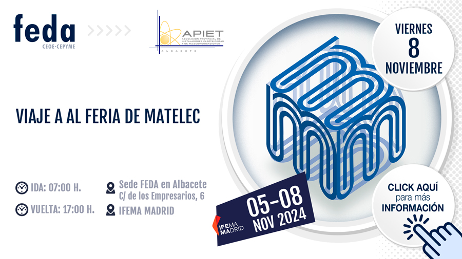 El objetivo de esta actuación es organizar una visita a la feria profesional MATELEC 2024 que tendrá lugar en Madrid entre los días 5 y 8 de noviembre. El viaje será el día 8 de noviembre, con salida de Albacete a las 7:00 (desde la puerta de FEDA) y regreso a las 17:00 horas.