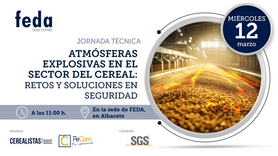 Jornada Técnica – “ATMÓSFERAS EXPLOSIVAS EN EL SECTOR DEL CEREAL: RETOS Y SOLUCIONES EN SEGURIDAD”. Si estas interesado puedes inscribirte antes del día 11 de marzo, a través del formulario que se abre al hacer clic en la imagen, donde podrás consultar el programa La jornada será impartida por Dolores Cuerda López, responsable de la Delegación de SGS Albacete, Cuenca y Guadalajara. Los contenidos de la jornada han sido creados atendiendo exclusivamente a las necesidades del sector cerealista. |
