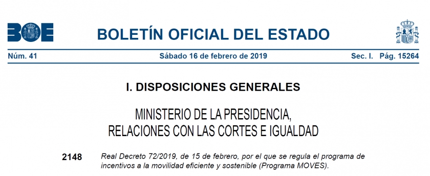El 17 de febrero de 2019, entro en vigor el Real Decreto 72/2019 por el que se regula el Programa de Incentivos a la Movilidad Sostenible y Eficiente (Programa MOVES).
