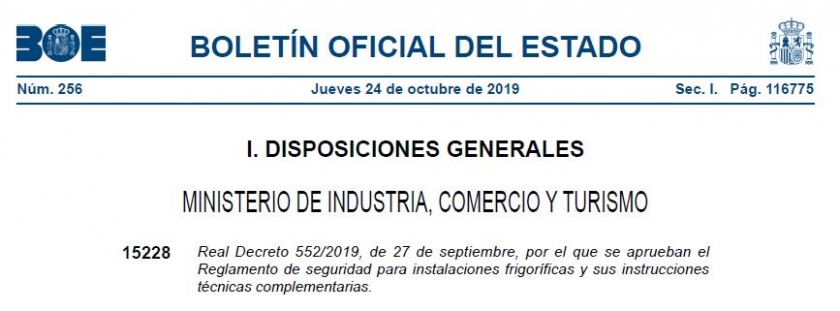 El día 24 de octubre se publicó en el Boletín Oficial del Estado el Real Decreto 552/2019, de 27 de septiembre, por el que se aprueban el Reglamento de seguridad para instalaciones frigoríficas y sus instrucciones técnicas complementarias (RSIF).