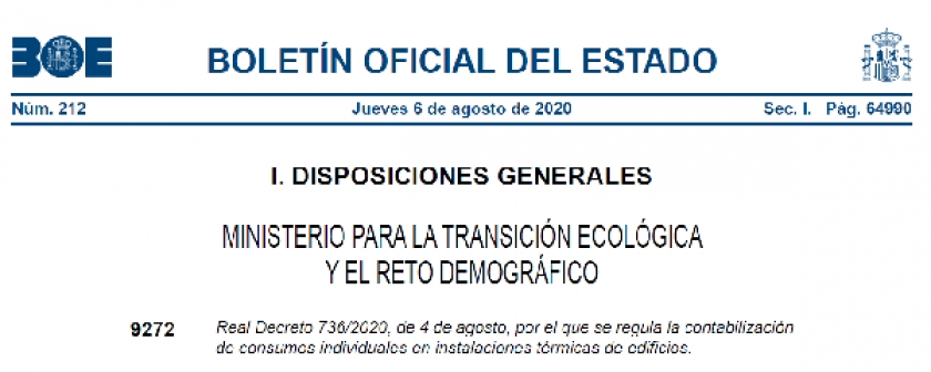 El día 6 de agosto de 2020 se ha publicado en el Boletín Oficial del Estado el Real Decreto 736/2020, de 4 de agosto, por el que se regula la contabilización de consumos individuales en instalaciones térmicas de edificios y que entra en vigor al día siguiente.