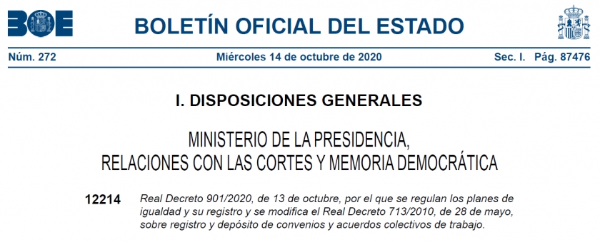 Se ha publicado el Real Decreto 901/2020, 13 de octubre, por el que se regulan los planes de igualdad y su registro, que tiene por objeto el desarrollo reglamentario de los planes de igualdad, así como su diagnóstico, incluidas las obligaciones de registro, depósito y acceso.