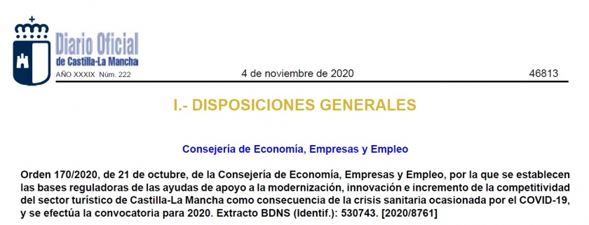 Ha sido publicada en el DOCM de 4 de noviembre la Orden 170/2020, por la que se establecen las bases reguladoras de las ayudas de apoyo a la modernización, innovación e incremento de la competitividad en el sector turístico de Castilla-La Mancha, como consecuencia de la crisis sanitaria originada por el COVID-19 y se efectúa la convocatoria para 2020.