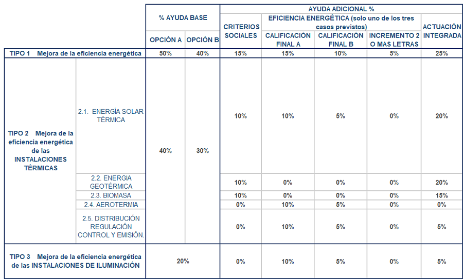 La Ayuda Base será diferente dependiendo de si las actuaciones se realizan bajo la opción A o la opción B y de la tipología de la actuación.