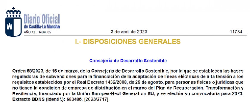 El 7 de agostose publicó en el DOCM la Resolución de 30/07/2024, de la Dirección General de Medio Natural y Biodiversidad, por la que se convocan las ayudas para la financiación de la adaptación de líneas eléctricas de alta tensión a los requisitos establecidos por el Real Decreto 1432/2008, de 29 de agosto, para personas físicas o jurídicas que no tienen la condición de empresa de distribución en el marco del Plan de Recuperación, Transformación y Resiliencia, financiado por la Unión Europea-Next Generation EU para el año 2024.