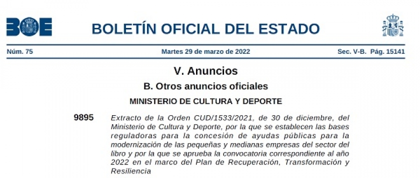 Hoy ha sido publicado en el BOE el Extracto de la Orden CUD/1533/2021 de 30 de diciembre de 2021, por la que se por la que se establecen las bases reguladoras para la concesión de ayudas públicas para la modernización de las pequeñas y medianas empresas del sector del libro y por la que se aprueba la convocatoria correspondiente al año 2022.