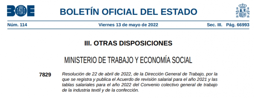 Se ha publicado la Resolución de 22 de abril de 2022, de la Dirección General de Trabajo, por la que se registra y publica el Acuerdo de revisión salarial para el año 2021 y las tablas salariales para el año 2022 del Convenio Colectivo General de Trabajo de la Industria Textil y de la Confección.