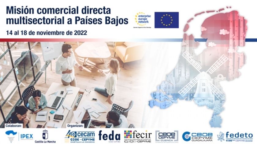 El Instituto de Promoción Exterior de Castilla-La Mancha (IPEX),con la colaboración con la Confederación de Empresarios de Castilla-La Mancha (CECAM), promueve la participación agrupada de empresas de todos los sectores en la MISIÓN COMERCIAL DIRECTA A PAÍSES BAJOS 2022 que tendrá lugar del 14 al 18 noviembre en Rotterdam.