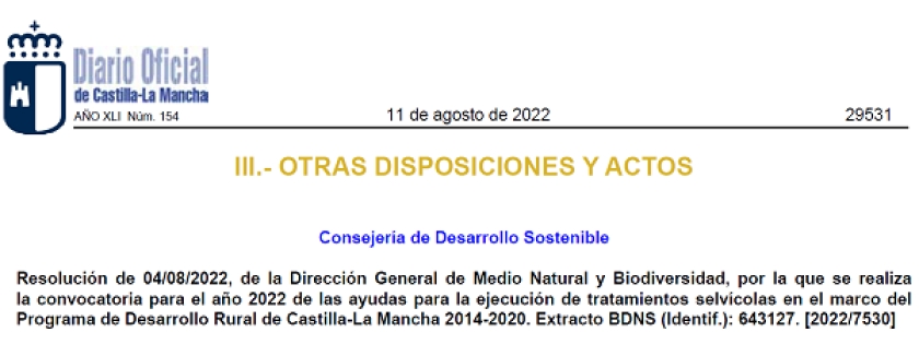 Se ha publicado la Resolución de 04/08/2022, de la Dirección General de Medio Natural y Biodiversidad, por la que se realiza la convocatoria para el año 2022 de las ayudas para la ejecución de tratamientos selvícolas en el marco del programa de Desarrollo Rural de Castilla-La Mancha 2014-2020.