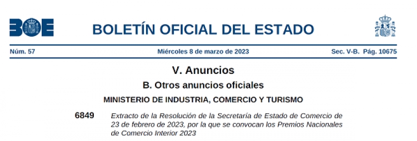 Se ha publicado en el BOE de 8 de marzo de 2023, la Resolución de la Secretaría de Estado de Comercio de 23 de febrero de 2023, por la que se convocan los Premios Nacionales de Comercio Interior 2023.