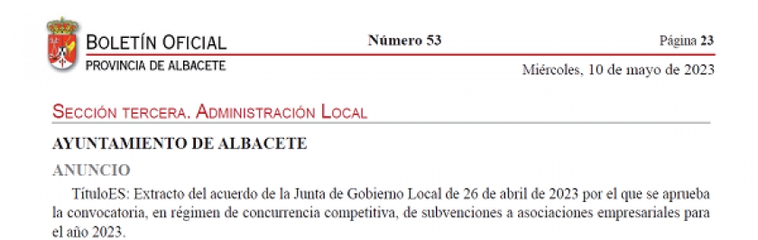 Se han publicado en el Boletín Oficial de la Provincia de Albacete de 10 de mayo de 2023, la convocatoria de subvenciones a asociaciones empresariales para 2023.