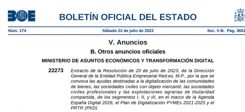 Con fecha 22 de julio de 2023, se ha publicado en el BOE el extracto de la resolución de 20 de julio de 2023 de la Dirección General de la Entidad Pública Empresarial Red.es, M.P., por la que se convoca las ayudas destinadas a la digitalización de las comunidades de bienes, las sociedades civiles con objeto mercantil, las sociedades civiles profesionales y las explotaciones agrarias de titularidad compartida, de los segmentos I, II, y III, en el marco de la Agenda España Digital 2026.