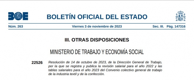 El pasado día 3 de noviembre se publicó en el BOE la Resolución de 14 de octubre de 2023, de la Dirección General de Trabajo, por la que se registra y publica la revisión salarial para el año 2022 y las tablas salariales para el año 2023 del Convenio colectivo general de trabajo de la industria textil y de la confección.