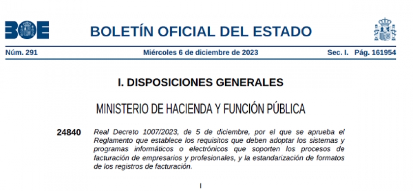 El pasado 6 de diciembre de 2023, se publicó en el BOE el Real Decreto 1007/2023, de 5 de diciembre, por el que se aprueba el Reglamento que establece los requisitos que deben adoptar los sistemas y programas informáticos o electrónicos que soporten los procesos de facturación de empresarios y profesionales, y la estandarización de formatos de los registros de facturación.