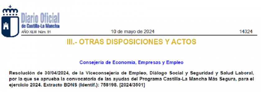 Se ha publicado en el Diario Oficial de Castilla – La Mancha la Resolución de 30/04/2024, de la Viceconsejería de Empleo, Diálogo Social y Seguridad y Salud Laboral, por la que se aprueba la convocatoria de las ayudas del Programa Castilla-La Mancha Más Segura, para el ejercicio 2024.