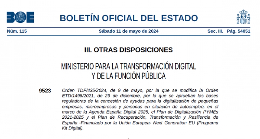 Con fecha 11 de mayo de 2024, se ha publicado en el BOE la Orden TDF/435/2024, de 9 de mayo, por la que se modifica la Orden ETD/1498/2021, de 29 de diciembre, por la que se aprueban las bases reguladoras de la concesión de ayudas para la digitalización de pequeñas empresas, microempresas y personas en situación de autoempleo, en el marco de la Agenda España Digital 2025 – Programa Kit Digital.