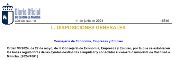Se han publicado en el Diario Oficial de Castilla la Mancha de 11 de junio de 2024, la orden 93/2024 por la que se establecen las bases reguladoras de las ayudas destinadas a impulsar y consolidar el comercio minorista de Castilla-La Mancha, y en el DOCM de 9 de julio de 2024 la resolución 02/07/2024 por la que se convocan dichas ayudas.