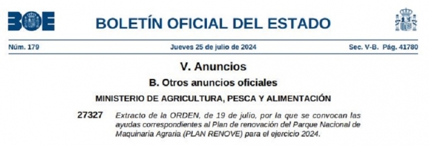 Publicado el extracto de la Orden 19 de julio, (B.O.E 25.07.2024), del Ministerio de Agricultura, Pesca y Alimentación por la que se convocan las ayudas correspondientes al Plan de Renovación del Parque Nacional de Maquinaria Agraria (PLAN RENOVE) para el ejercicio 2024.