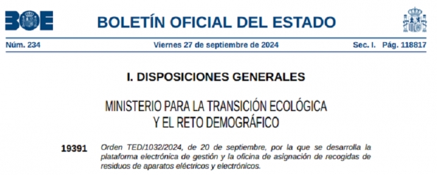 Se ha publicado la Orden TED/1032/2024, de 20 de septiembre, en la que se establece un marco legal que permitirá la implementación de una plataforma electrónica destinada a coordinar y optimizar las actividades de recogida y tratamiento de RAEE en todo el territorio nacional.