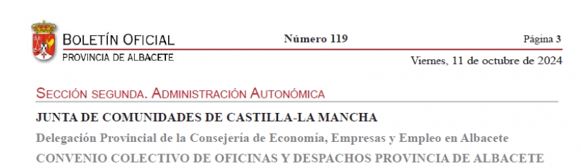 Con fecha 11 de octubre de 2024, se ha publicado en el BOP el Convenio Colectivo de Oficinas y Despachos para la provincia de Albacete.