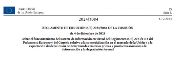 Se ha publicado en el Diario Oficial de la Unión Europea (DOUE) el Reglamento de Ejecución (UE) 2024/3084 de la comisión, de 4 de diciembre de 2024, sobre el funcionamiento del sistema de información EUDR en virtud del Reglamento (UE) 2023/1115 relativo a la comercialización en el mercado de la Unión y a la exportación desde la Unión de determinadas materias primas y productos asociados a la deforestación y la degradación forestal.