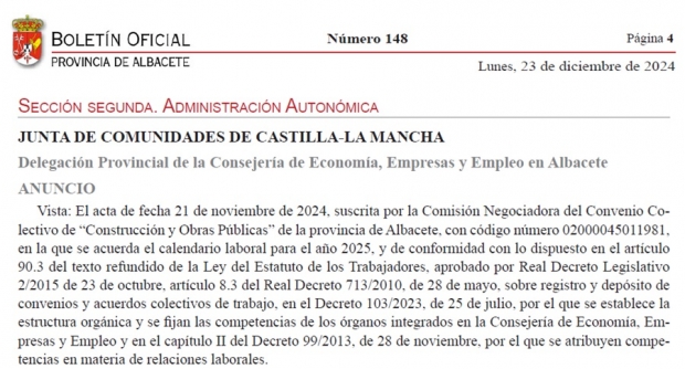 El día 23 de diciembre de 2024 se ha publicado, en el Boletín Oficial de la Provincia, el calendario laboral de “Construcción y Obras Públicas” para el año 2025.