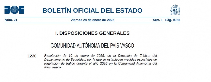 El pasado 24 de enero de 2025, fue publicado en el BOE la Resolución de 10 de enero de 2025, de la Dirección de Tráfico, del Departamento de Seguridad, por la que se establecen medidas especiales de regulación de tráfico durante el año 2025 en la Comunidad Autónoma del País Vasco.