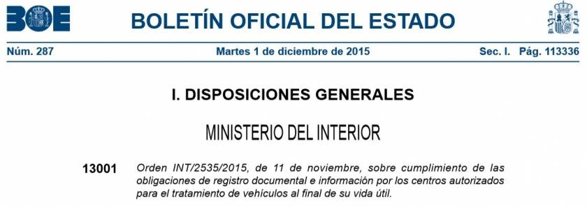 Hoy ha sido publicada en el BOE la Orden INT/2535/2015, de 11 de noviembre, sobre cumplimiento de las obligaciones de registro documental e información por los centros autorizados para el tratamiento de vehículos al final de su vida útil.
