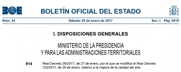 El nuevo Real Decreto 39/2017 modifica el Real Decreto 102/2011, relativo a la mejora de la calidad del aire, e incorpora al derecho nacional la Directiva 2015/1480, que establece las normas relativas a los métodos de referencia, la validación de datos y la ubicación de los puntos de muestreo para la evaluación de la calidad del aire ambiente.