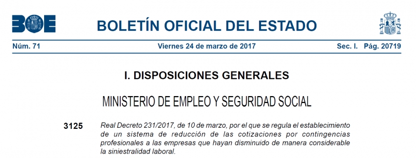 Ha sido publicado el Real Decreto 231/2017, de 10 de marzo, por el que se regula el establecimiento de un sistema de reducción de las cotizaciones por contingencias profesionales a las empresas que hayan disminuido de manera considerable la siniestralidad laboral.