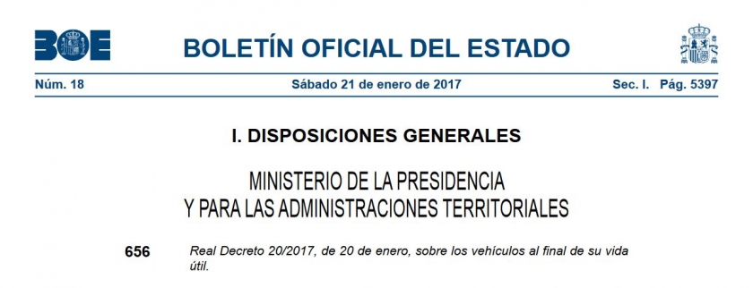 El Ministerio de Agricultura y Pesca, Alimentación y Medio Ambiente ha aprobado el Real Decreto 20/2017, de 20 de enero, sobre los vehículos al final de su vida útil, que regula, adapta y sistematiza todos los aspectos relacionados con los vehículos al final de su vida útil, de conformidad con la Directiva 2000/53/CE, relativa a los vehículos al final de su vida útil y la Ley 22/2011, de residuos y suelos contaminados.