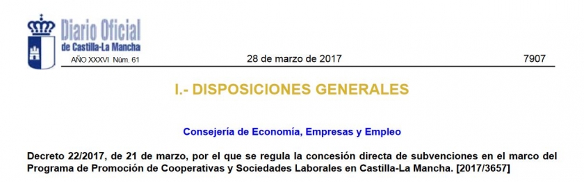 Han sido publicadas en el DOCM las subvenciones para la Promoción de Cooperativas y Sociedades Laborales con la finalidad de favorecer la Creación, Consolidación y Modernización de dichas entidades en Castilla- La Mancha, consolidando el tejido empresarial existente, estimulando el empleo e incrementando su rentabilidad.