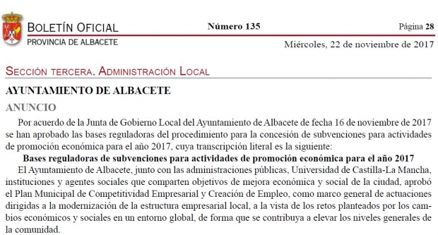 Bases reguladoras de subvención para actividades de promoción económica para el año 2017 en el siguiente enlace