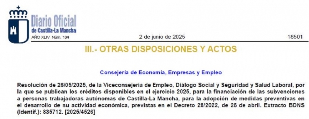 Se ha publicado la Resolución de 26/05/2025, de la Viceconsejería de Empleo, Diálogo Social y Seguridad y Salud Laboral, por la que se publican los créditos disponibles para el ejercicio 2025, para la financiación de subvenciones a personas trabajadoras autónomas de Castilla-La Mancha, para la adopción de medidas preventivas en el desarrollo de su actividad económica.