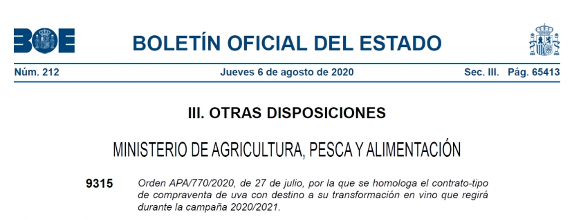- Orden APA/770/2020, 27 de julio, por la que se homologa el contrato-tipo para las operaciones de compraventa de uva con destino a su transformación en vino que regirá durante la campaña 2020/2021.