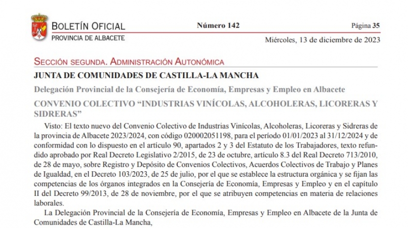 Ayer se publicó en el Boletín Oficial de la Provincia de Albacete, BOP, el convenio colectivo de las “Industrias vinícolas, alcoholeras, licoreras y sidreras” 2023/2024, suscrito el pasado 1 de septiembre por la patronal Asociación de Empresarios del Vino de Albacete (integrada en FEDA) y los sindicatos CC.OO. y UGT.