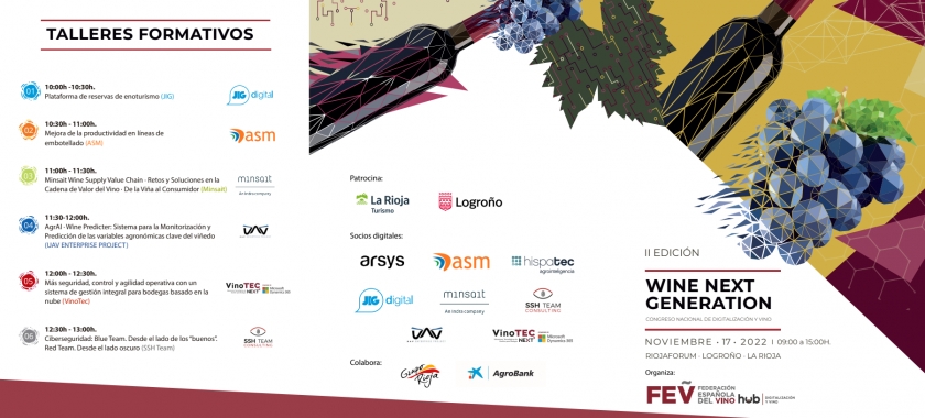 La Federación Española del Vino (FEV) y su HUB de Digitalización y Vino organiza la 2ª edición de Wine Next Generation el 17 de noviembre, con el patrocinio del Gobierno de La Rioja y Ayuntamiento de Logroño y la colaboración de Grupo Rioja y AgroBank.