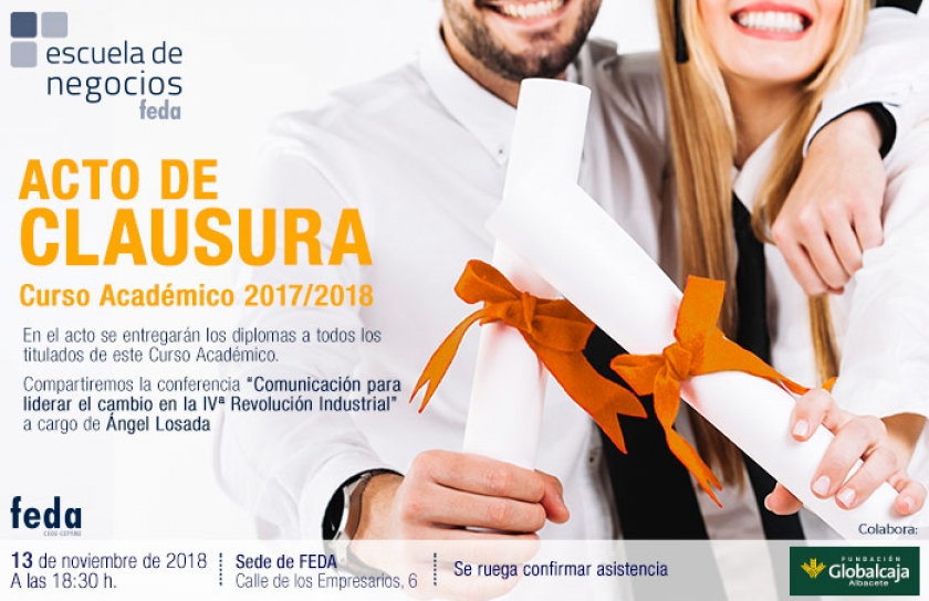 Mañana martes, día 13 de noviembre, Escuela de Negocios FEDA clausura su curso académico 2017-2018 y dará por iniciado el nuevo programa 2018-2019. Será en el transcurso de un acto institucional que tendrá lugar a las 19,30 h. en la sede de FEDA (c/de los Empresarios, 6).