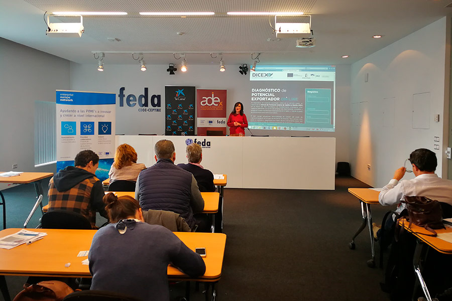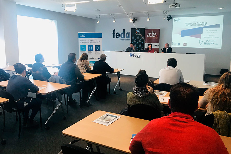 María Ángeles Mora, consultora y formadora en internacionalización con más de 20 años de experiencia en gestión y operaciones de comercio exterior e intracomunitarias en múltiples sectores, docente en certificados de profesionalidad internacional, promotor PIPE y asesor técnico del Área Internacional de FEDA, ofreció a todos los participantes herramientas para muchos desconocidas y Évelin R. Molano, como responsable del Departamento de Asociaciones y Áreas Técnicas FEDA, desde donde se dirige las áreas estratégicas de consultoría indispensables para las empresas que van desde la innovación, medio ambiente y calidad, inversión, PRL y por supuesto internacional, presentó los servicios de la Enterprise Europe Network, un proyecto europeo del que FEDA forma parte y ofrece la oportunidad de buscar y publicar ofertas y demandas comerciales y tecnológicas de calidad.