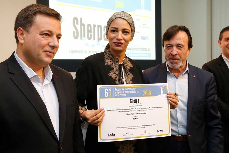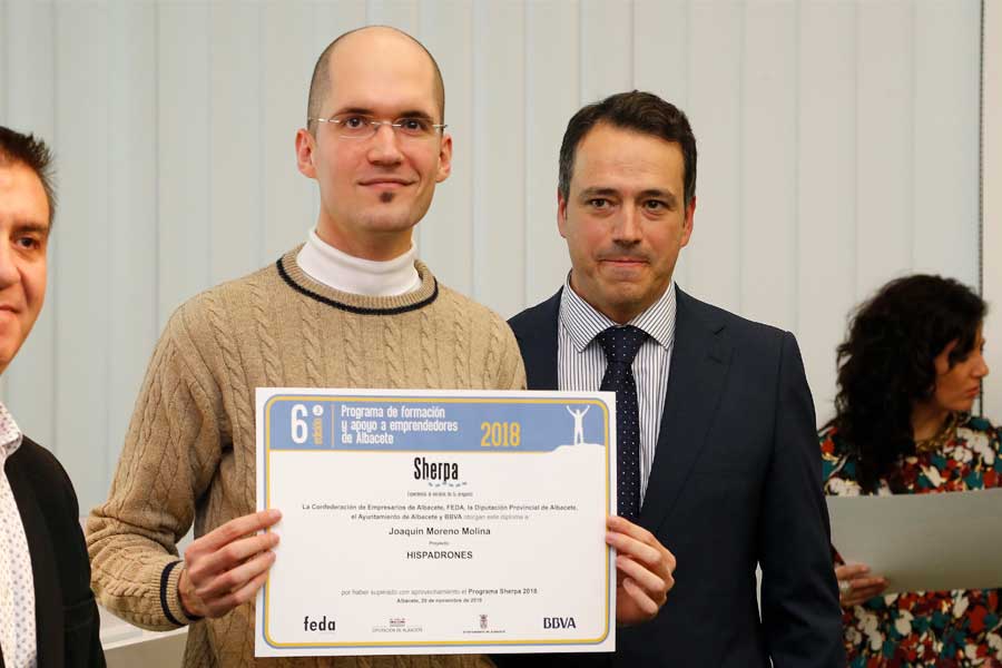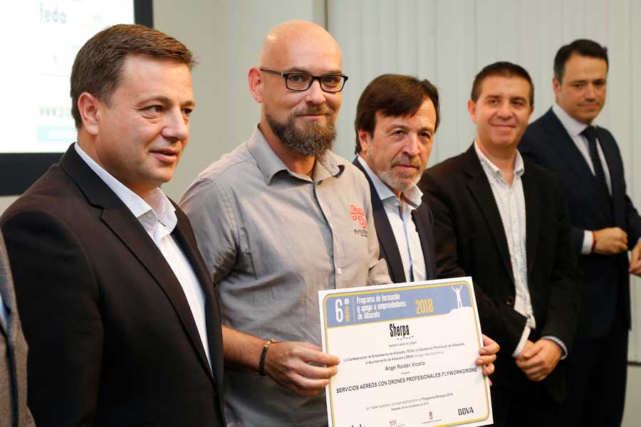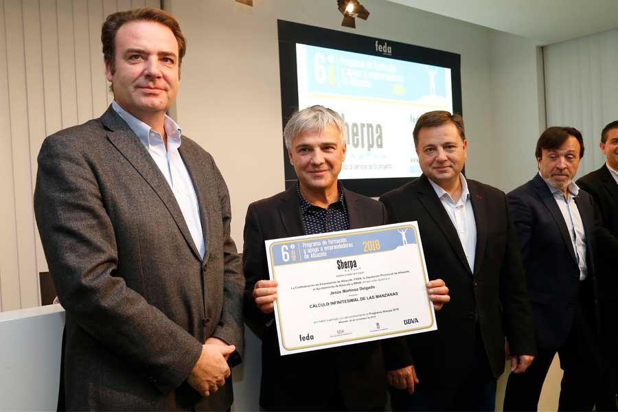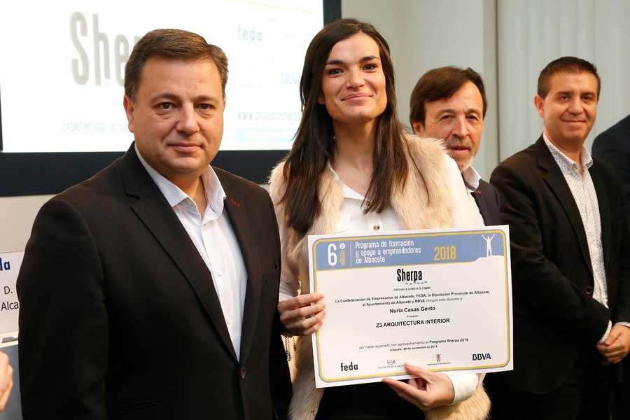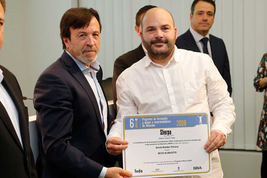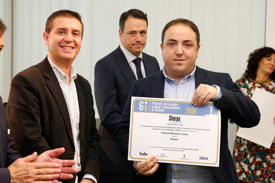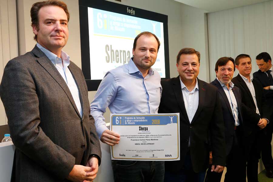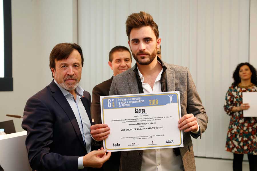 El emprendedor Fernando Monteagudo López, con su proyecto XUQ Grupo de Alojamiento Turístico, ha sido el ganador del premio principal del Programa Sherpa’2018-VI Edición, dotado con 6.000 euros. La sede de la Confederación de Empresarios de Albacete, FEDA, ha acogido el evento final de este programa de apoyo a emprendedores que se desarrolla con el apoyo de Diputación Provincial, Ayuntamiento de Albacete y BBVA.