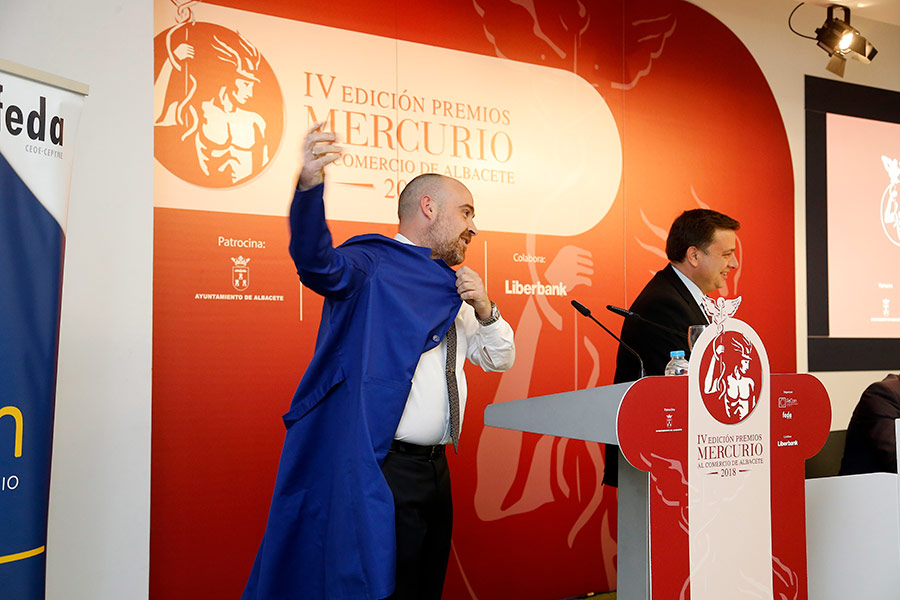 El presidente de la Federación de Comercio de Albacete, José Lozano, en el acto de los Premios Mercurio, se puso la bata de tendero e hizo un alegato, defensa del comercio de toda la vida