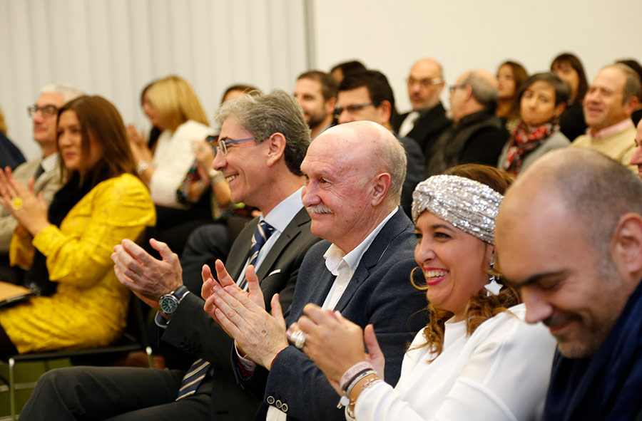 Tras los saludos y agradecimientos, José Lozano pidió permiso: “Me van a permitir que me cambie de hábito, los que me conocen y aquí cada vez me conocen mejor, saben que no soy muy de trajes” y se enfundó la chaqueta o bata de comerciante: “Esta bata ya es otra cosa, pensarán que esto no es tendencia hoy por hoy, pero un día lo fue (apareciendo al mismo tiempo en pantalla la foto de Pedro Nieto, un trabajador del pequeño comercio, con el uniforme de aquellos años) y si me la he puesto es para reivindicar nuestro comercio de toda la vida. Un comercio responsable, que no intenta meterles a los clientes los productos por los ojos a toda costa con tal de lucrarse. Un comercio que se desangra día a día, en parte porque le cuesta adaptarse a este nuevo tiempo, y también por la inconsciencia de muchos de nosotros, que nos dejamos seducir por los cantos de sirena de Internet, que más que ayudarte lo que hacen es ayudarse, y abandonamos al que realmente contribuye con su esfuerzo a nuestro bienestar, y además de manera sincera”.