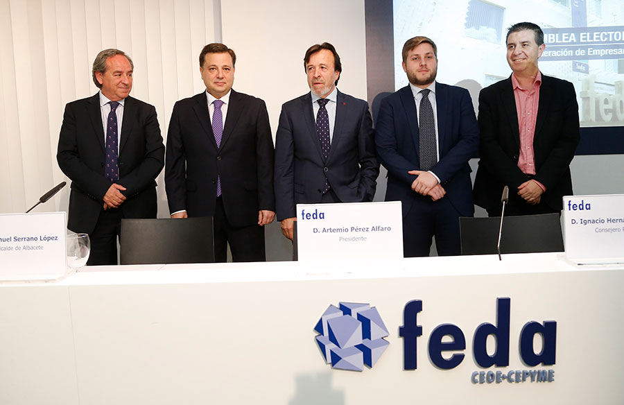 Mañana día 23 de febrero Artemio Pérez Alfaro, empresario hellinero del sector de la construcción (Comuñas y Artemio, S.L.), cumplirá 20 años al frente de la Presidencia de FEDA y ayer, en la Asamblea Electoral, fue reelegido para continuar al frente de la Confederación durante los próximos cuatro años, junto con el siguiente grupo de empresarios que forman el Comité Ejecutivo: