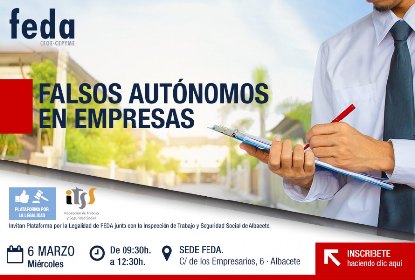 Por ello, desde la Plataforma por la Legalidad de FEDA, en colaboración con la Inspección de Trabajo y Seguridad Social de Albacete, se ha convocado una jornada informativa, el miércoles 6 de marzo, a las 9,30 horas, para analizar las situaciones actuales que se encuentran las empresas que tienen contratados mercantilmente a trabajadores autónomos y, si fuera el caso, corregirlas o como mínimo minimizar las sanciones que pudieran deparar al ser inspeccionados.